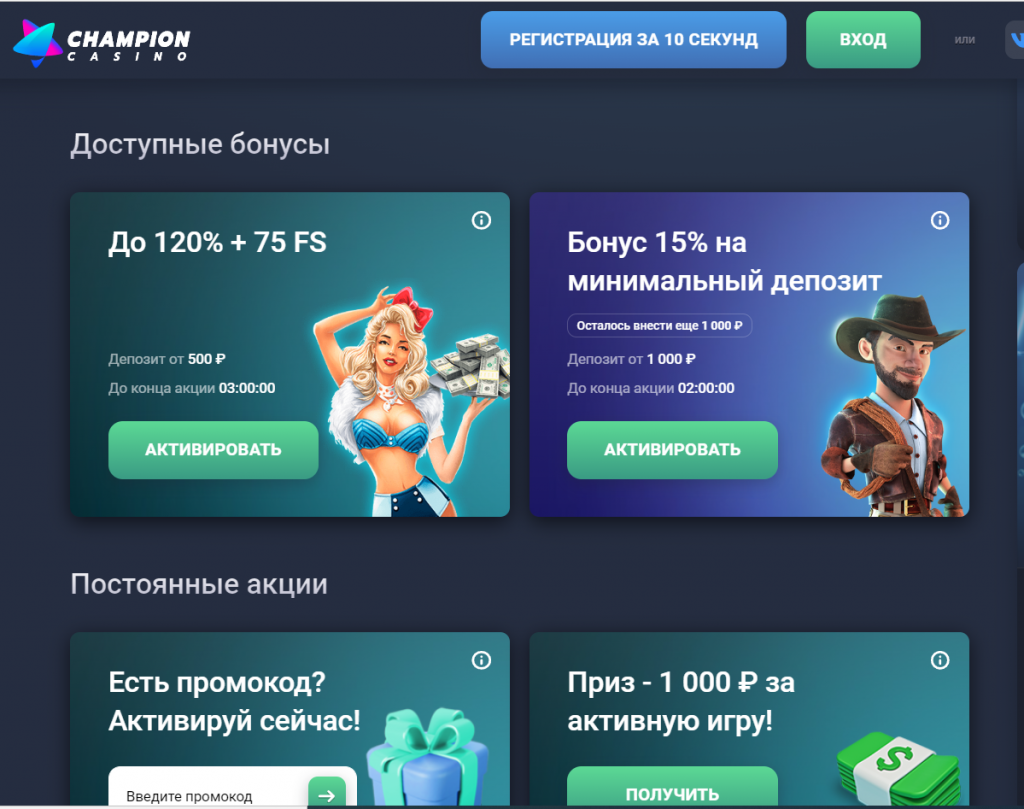 Популярность casino Champion обусловлена множеством факторов, но больше всего игроков в нем привлекают акции с щедрыми подарками. Обычно это денежные суммы или фриспины. Получить в Champion casino бонусы несложно – потребуется пройти регистрацию, выполнить условия акции, иногда использовать промокоды для активации рекламного предложения.