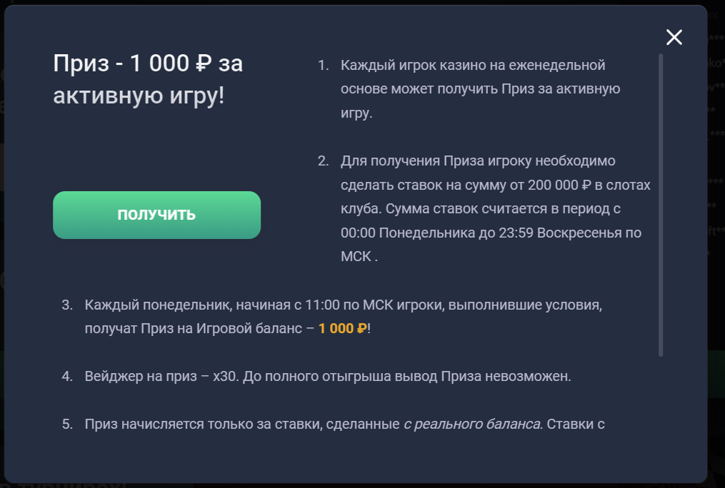 - 1000 р. за активную игру клуб дарит клиентам, которые сделают ставки в любой slot (или несколько) на 200 т. р. Учитываются ставки за неделю. Независимо какой slot выбрал игрок, ставки в «риск-игре» не засчитываются.