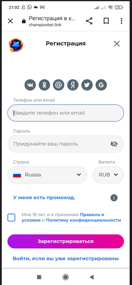 Регистрация в Champion casino